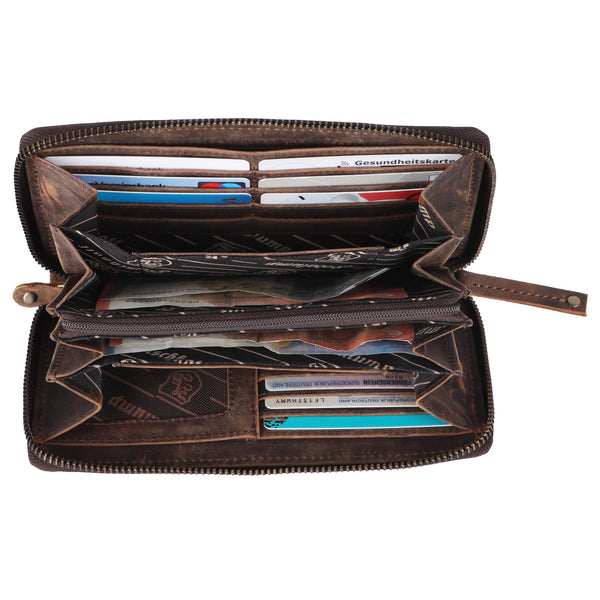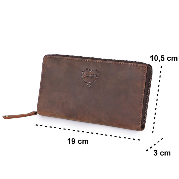 Die Gretl verfügt über eine durchdachte Innenaufteilung mit mehreren Kartenfächern, einem großen Scheinfach und einem sicheren Münzfach mit Reißverschluss. Besonders praktisch ist das separate Handyfach, das deinem Smartphone sicheren Platz bietet, ohne dass es an anderer Stelle in der Tasche herumfliegen muss. Das hochwertige Echtleder sorgt dafür, dass die Börse nicht nur gut aussieht, sondern auch mit der Zeit eine schöne Patina entwickelt.