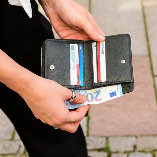 Im Inneren bietet sie eine durchdachte Aufteilung: mehrere Kartenfächer, ein geräumiges Scheinfach sowie ein sicheres Münzfach mit Druckknopf. Alles findet seinen Platz – übersichtlich und schnell griffbereit. Die mittelgroße Form macht sie angenehm handlich, ohne Kompromisse bei der Funktionalität einzugehen.