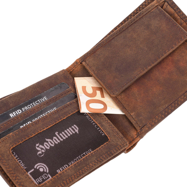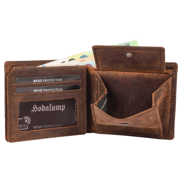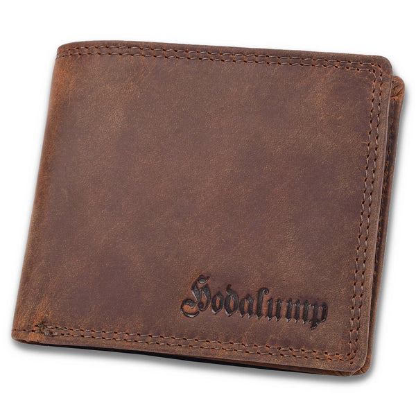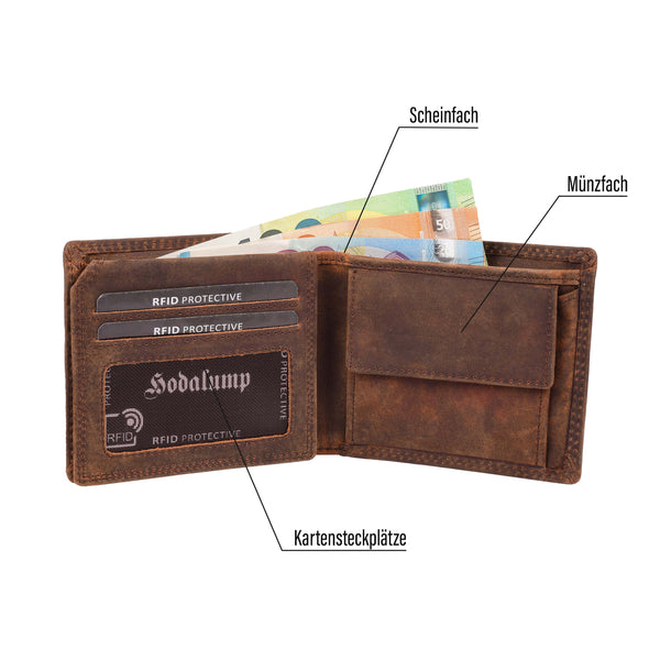 Innen sorgt eine durchdachte Aufteilung für Ordnung: Mehrere Kartenfächer, ein großes Scheinfach, ein sicheres Münzfach mit Druckknopf sowie ein zusätzliches Steckfach für Belege oder Ausweise. Der klassische Stil mit klaren Linien und dezentem Hodalump-Branding macht Raini zum stilvollen Allrounder – für Männer und Frauen, die es praktisch und ehrlich mögen.